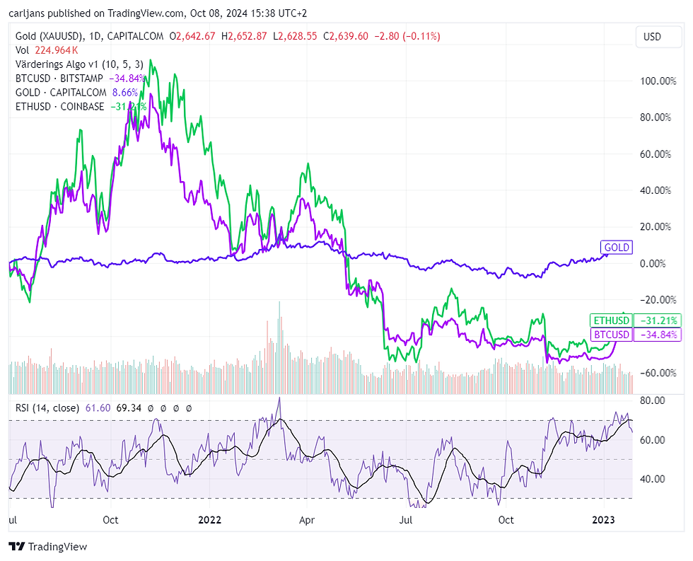 värdefulla saker. Bland annat att Guld är en bra inflationshedge och att krypto är en helt värdelös inflationshedge. Det var i mitten av 2021 som inflationen verkligen började ta fart runt om i värden. Till höger i bild ser ni den Sveriges KPI. Juli 2021 stod KPI på 1,3%. I Januari 2023 var den istället på 12,3%. Så hur presterade Guld vs det "digitala guldet" under denna period? Mixat, är väl det snabba svaret. Guld steg med +9% medan Bitcoin gick -35% och ETH backade med -31%. Och som ni ser har jag till och med varit "snäll" i min mätning. Jag har inte ens mätt från och med när krypto faktiskt toppade av.